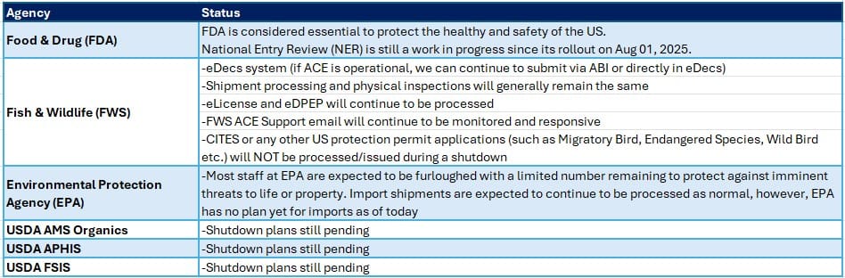 We’re expecting some Partner Government Agencies (PGAs) to be affected by a shutdown should it occur – this will impact documentation processing time where PGAs are involved. Below is our latest overview for how we think PGAs will be affected: