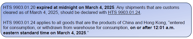 | China or Hong Kong | 9903.01.20 | Articles the product of China and Hong Kong except those listed in 9903.01.21, 9903.01.22 and 9903.01.23 (entered for consumption, or withdrawn from warehouse for consumption, on or after 12:01 a.m. eastern standard time on February 4, 2025, through March 3, 2025) | 10% |